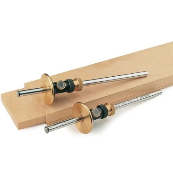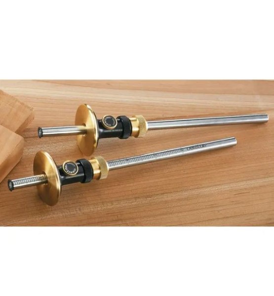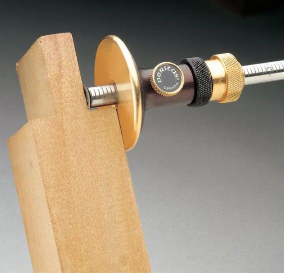 This Veritas metric graduated micro-adjust wheel marking gauge with its unprecedented marking accuracy offers full 3/16in (5mm) of fine adjustment. The sharp, hardened steel wheel cutter prevents tear out. Single bevel eliminates grain following. Fine cut line for accurate chisel positioning. Flush-mount wheel cutter for transferring dimensions. Recess in non-marring brass face protects wheel cutter when not in use.