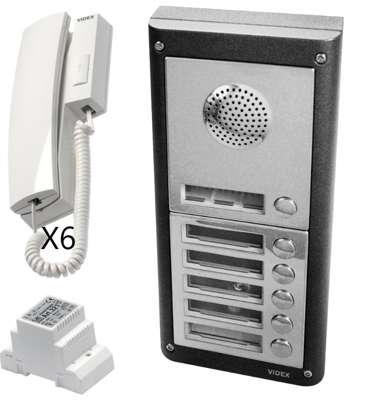 Kit includes surface mount door panel finished in gun metal grey with matt finish facia, 321 12vac 15VA DIN box transformer and six 3011 wall mount handsets with electronic call tone and lock release facility.
