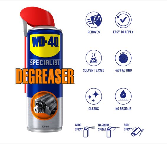 WD-40 Specialist® Degreaser is an industrial strength degreaser and cleaner that works immediately on contact to break down and remove stubborn and heavy soiling such as oil, grease, dirt and grime. WD-40 Specialist Degreaser has a fluid consistency and powerful discharge making it easy to use, leaving no residue behind. Simply rinse or wipe away for a clean finish. The fast-acting spray will quickly clean tools, machinery, engines, chains and gears, removing any containments that may cause wear and tear, ensuring that your equipment stays running smoothly for longer.