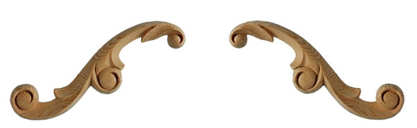 Wild Goose Carving 599. Stylized slim-line leaf onlay, can be used as an edge rail or surface appliqué creating a natural arched effect. Can be configured with various classical centerpieces. The American reference term for this wood scroll is gingerbread onlay or gingerbread house trim and has applications as an arabesque scroll onlay in antique furniture restoration