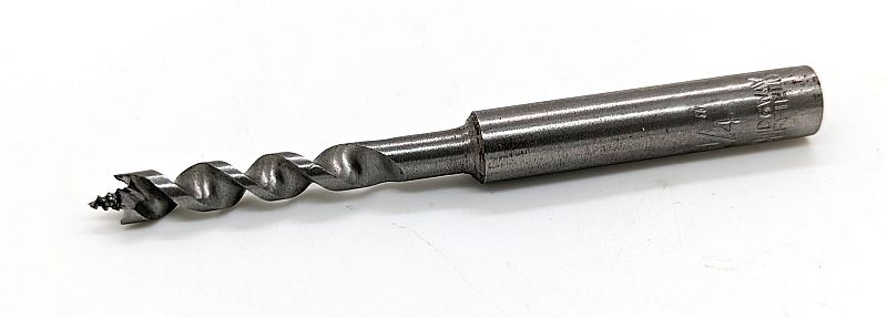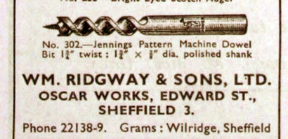 Machine dowel bit made by Wm Ridgway of Sheffield. 1/4in bit with 3/8in shank. Bit is 1.34in long, 3.1/2in overall. These are new bits which have been in stock for some years.