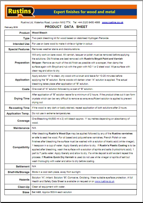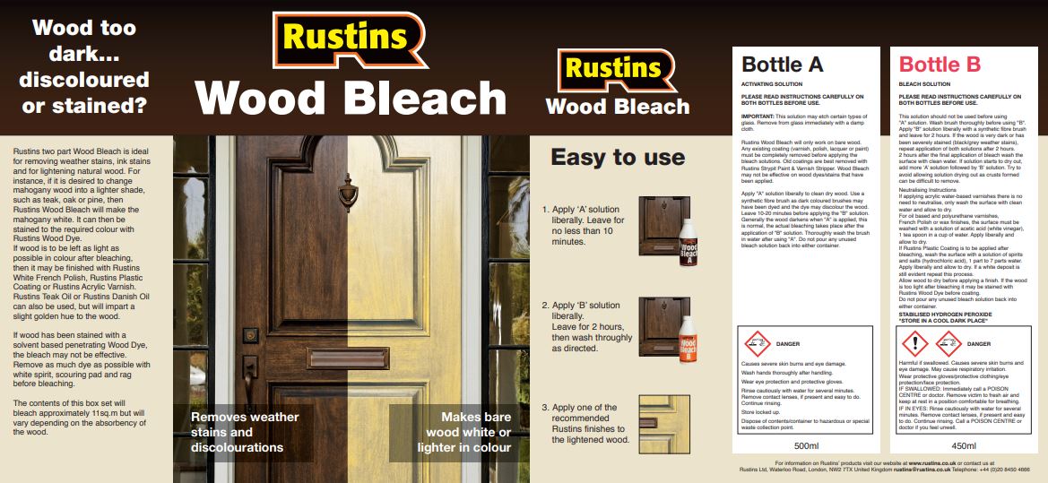 Removes weather stains and discolourations. Makes bare wood white or lighter in colour. Use to bleach natural timber to a lighter shade so it can then be stained to another wood shade, using Rustins Wood Dyes.