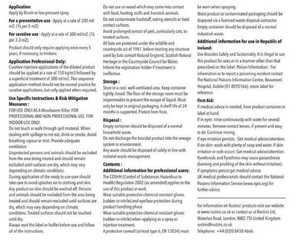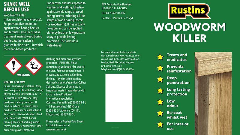 Rustins Woodworm Killer is a low odour, deep penetrating treatment. It treats, eradicates and prevents reinfestation, giving long lasting protection. Re-coat surface whilst wet. Suitable for interior use and on all types of wood.