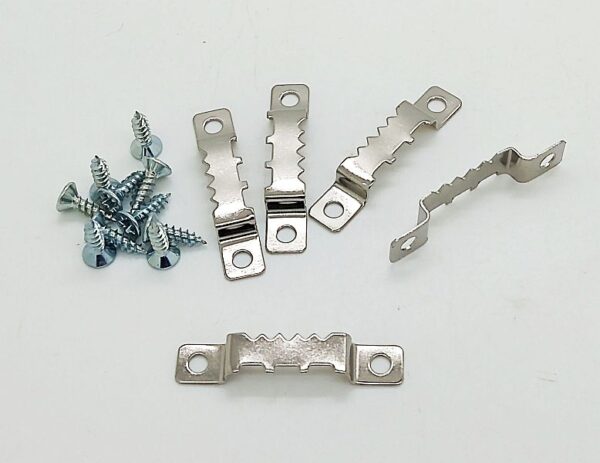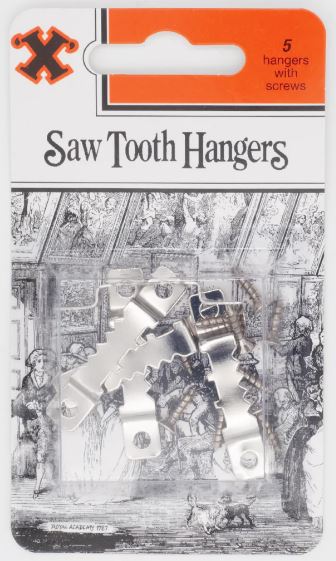Pack of 5 saw tooth picture hangers. Screws are 34mm centres. Zinc plated.
