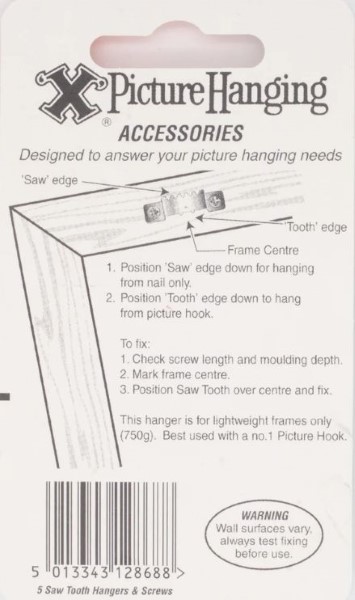 Home » HARDWARE » CABINET FITTINGS » PICTURE & MIRROR FITTINGS » X 12868 Picture Hangers Saw Tooth Zinc Plated (PK 5)