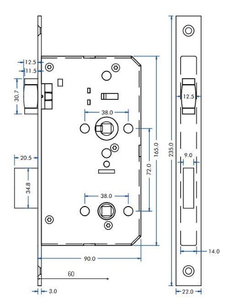 DIN Lift To Lock. BS EN 12209 2003 : Grade 3. 72mm Centres 8mm Followers 60mm backset. 90mm Case Depth Square profile – 22mm Grade 304 stainless steel forend. Grade 304 stainless steel latchbolt & deadbolt. Anti-rattle strike. Grip tight follower.